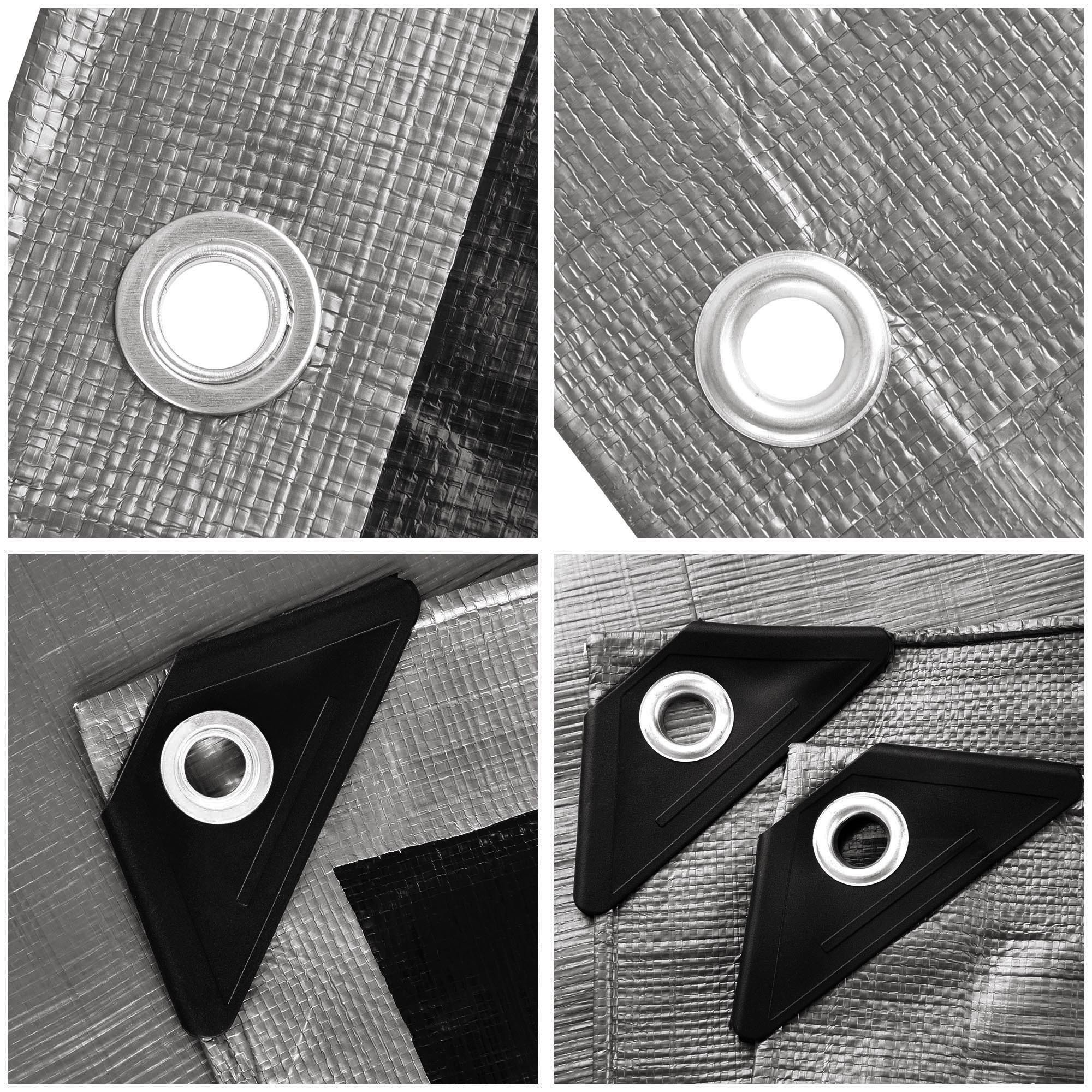 - Heavy Duty Sturdy Poly Tarp - Weights 9.72Lbs; 10mil heavy-duty thickness and aluminum grommets in 3 1/4 ft (1m) interval for better tear-resistance; PP plastics capped reinforced corners with grommets for sturdy construction; All seamless edges avoid water leakage