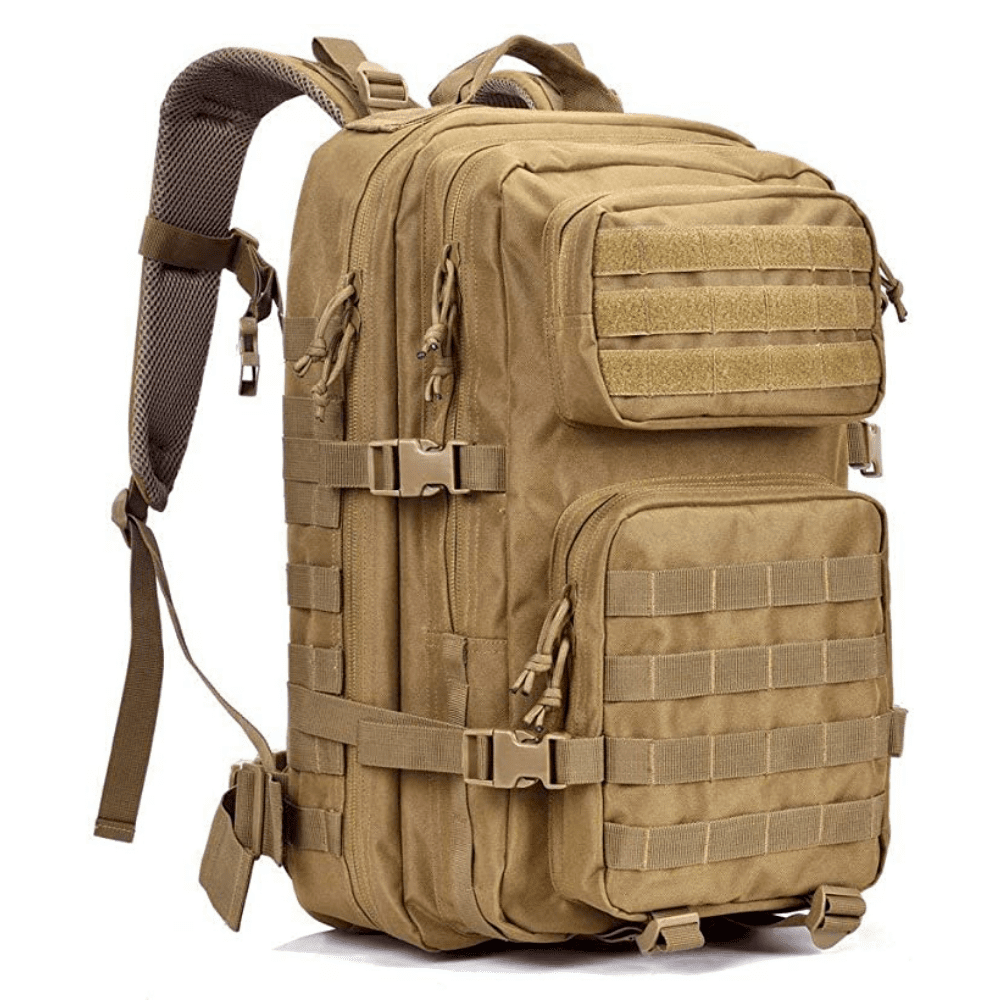 WATER-RESISTANT: This military tactical backpack is made of durable water-resistant 600D Oxford cloth. It has a 45L capacity and has a size of approximately 19” x 11” x 11” (48cm x 28cm x 28cm) and weighs in at 2.5lb (1.2kg).